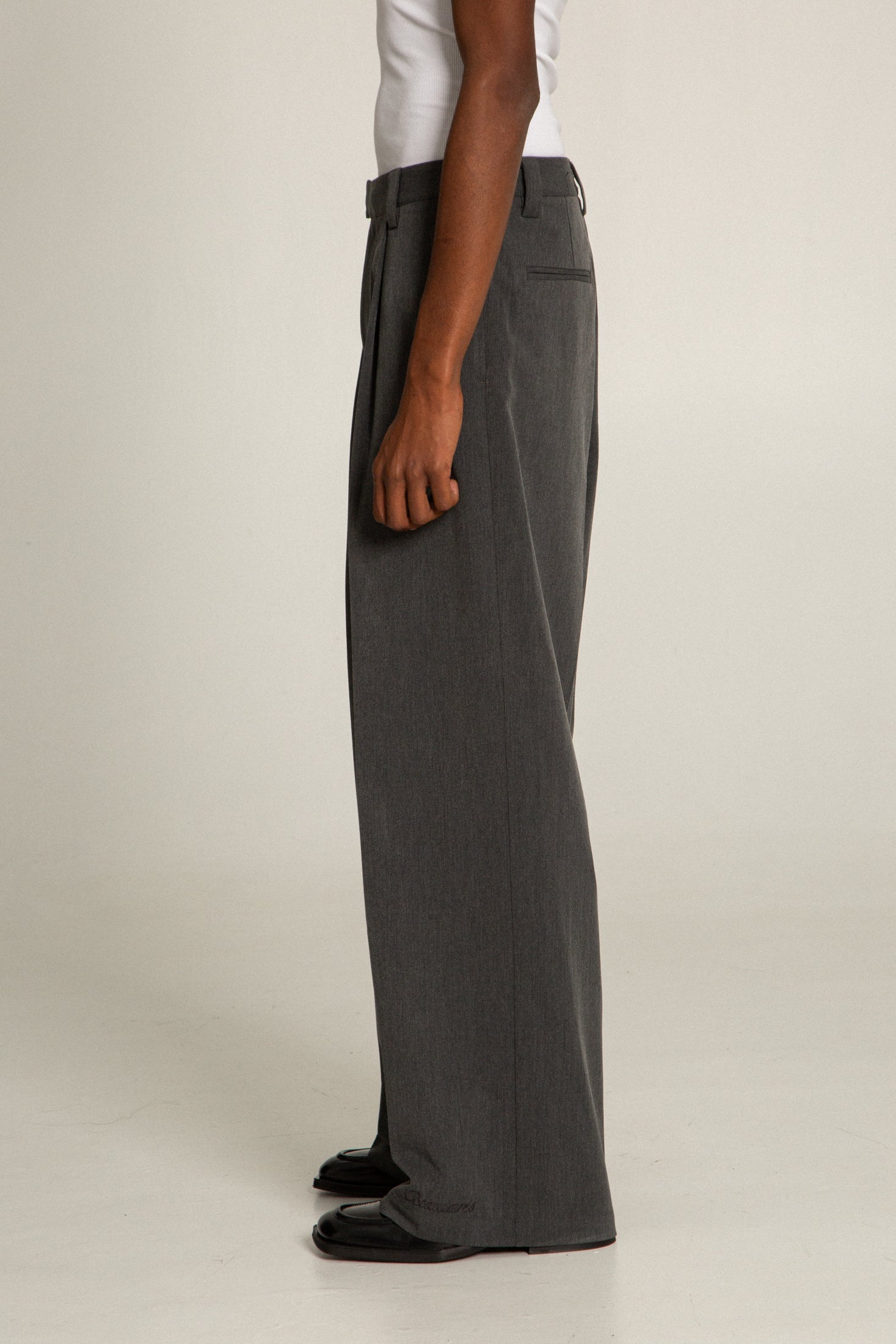 Tailored, wide-leg silhouette with front pleats for natural structure and flow. Crafted in a mid-weight fabric blend designed to be worn across seasons. Finished with subtle Beaularés script embroidery at the hem.